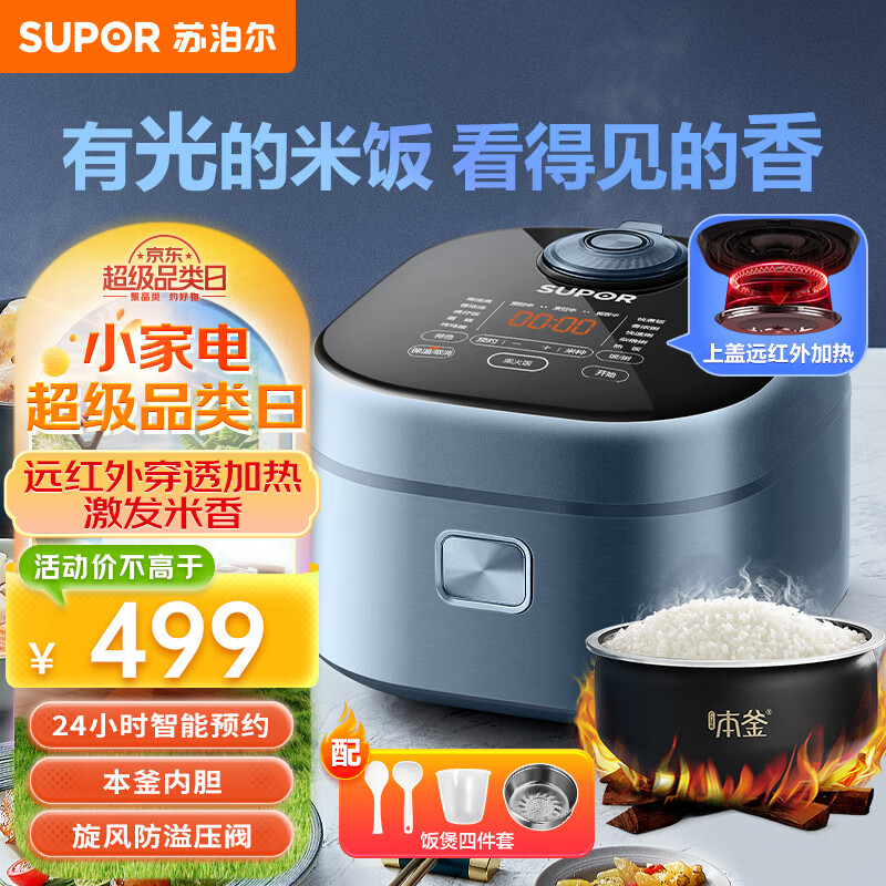 苏泊尔(SUPOR)电饭煲4L电饭锅3-8人家用本釜内胆远红外穿透加热技术大火多功能智能预约定时上盖可拆洗SF40FC686 4L价格:599.00元!