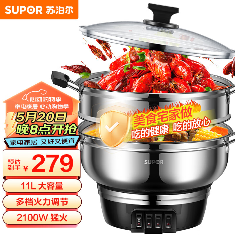 苏泊尔 SUPOR 电蒸锅多功能多用途锅 蒸包子锅电锅 加厚304不锈钢电炒锅电煮锅 电火锅 11L ZN32YK11价格:279.00元!