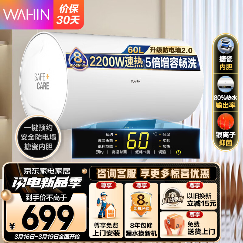 美的(Midea)出品60升家用电热水器储水式速热2200W大水量防电墙低耗节能上门安装以旧换新 华凌F6021-YJ2(HY)价格:699.00元!