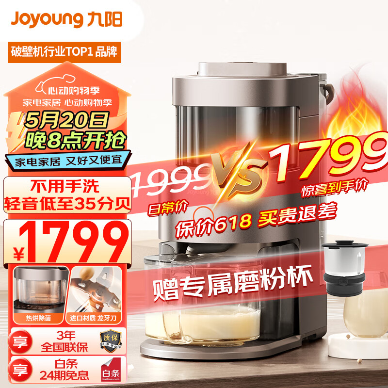 九阳免手洗破壁机 低噪音不用手洗高端多功能预约热烘除菌榨汁机轻音 豆浆机 Y1升级版价格:1799.00元!