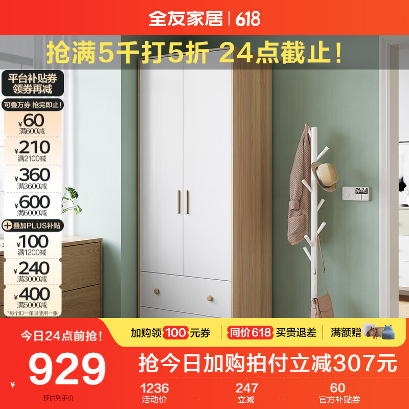 全友家居 衣柜现代北欧风二门衣柜卧室储物家具平开门衣柜126331价格:1236.25元!