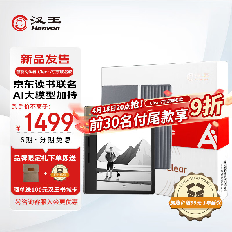 汉王(Hanvon)Clear 7英寸电子书阅读器 京东读书联名款 墨水屏电纸书电子纸 看书学习便携阅读平板笔记本4+64版价格:1499.00元!