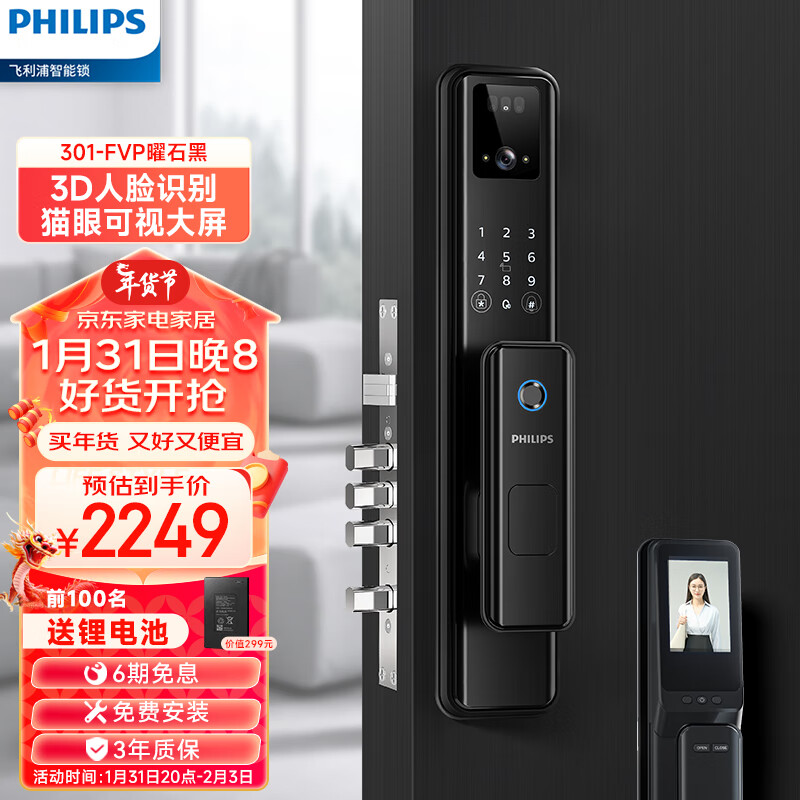 飞利浦(PHILIPS)智能锁301 智能门锁 指纹锁 密码锁防盗门锁WIFI智联按门铃抓拍 301FVP-曜石黑(人脸+大屏猫眼)价格:4099.00元!