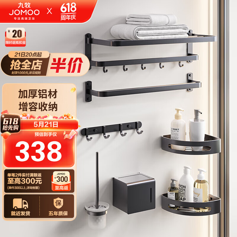 九牧(JOMOO)浴室置物架雅黑毛巾架免打孔挂件卫生间套装7件套9394157价格:388.00元!