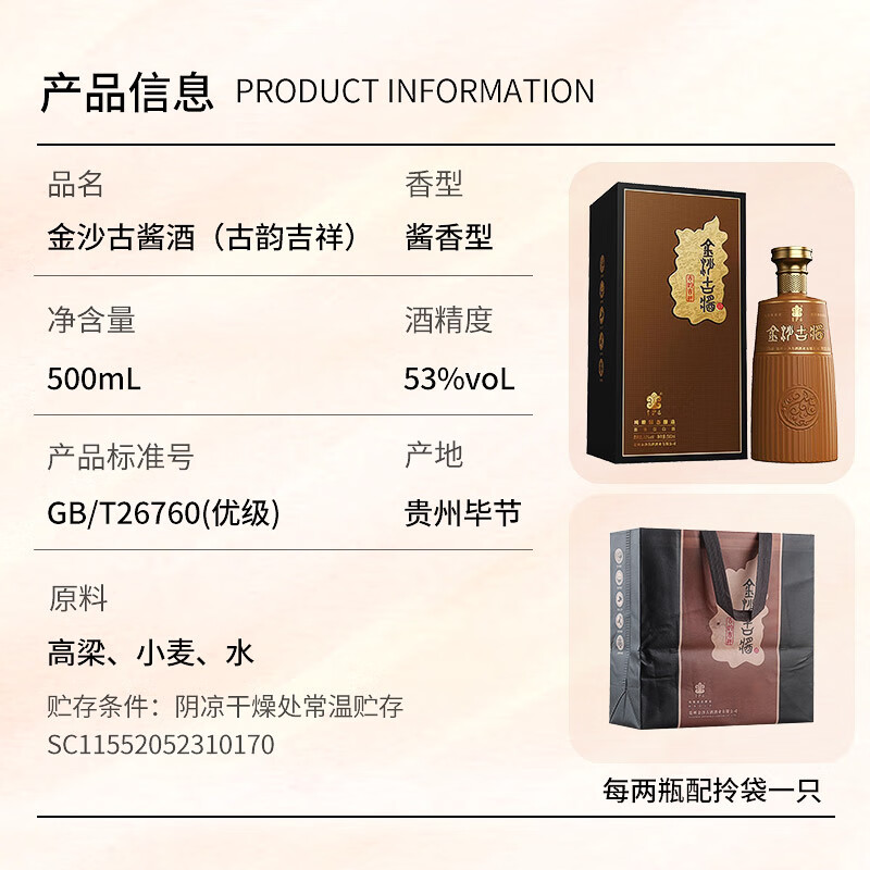 金沙古酱香型白酒 53度白酒 贵州白酒 金沙古酱古韵吉祥 整箱500ml*6瓶价格:496.25元!