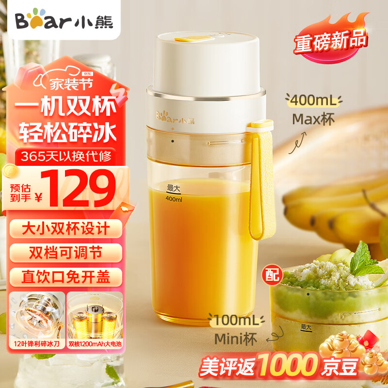 小熊(Bear)榨汁杯 榨汁机小型 榨汁机便携 果汁机 便携式榨汁机随行杯 双杯 LLJ-K05V8价格:129.00元!