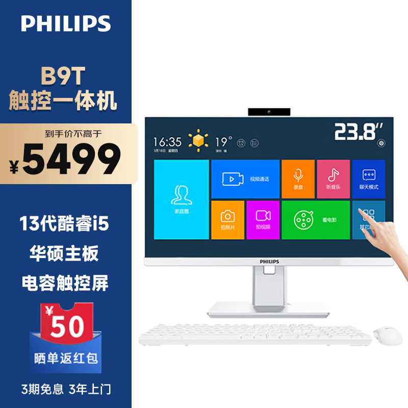 飞利浦B9T 23.8英寸触控台式一体机电脑 网课办公门店收银(13代i5-13400 16G 512GSSD 旋转升降 摄像头)白色价格:5499.00元!