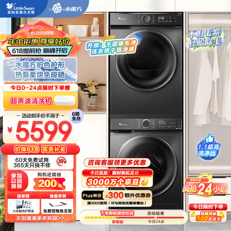 小天鹅(LittleSwan)水魔方洗烘套装 10KG滚筒洗衣机全自动+热泵烘干机 智能投放 除菌除螨 TG100V618PLUS+02价格:5599.00元!