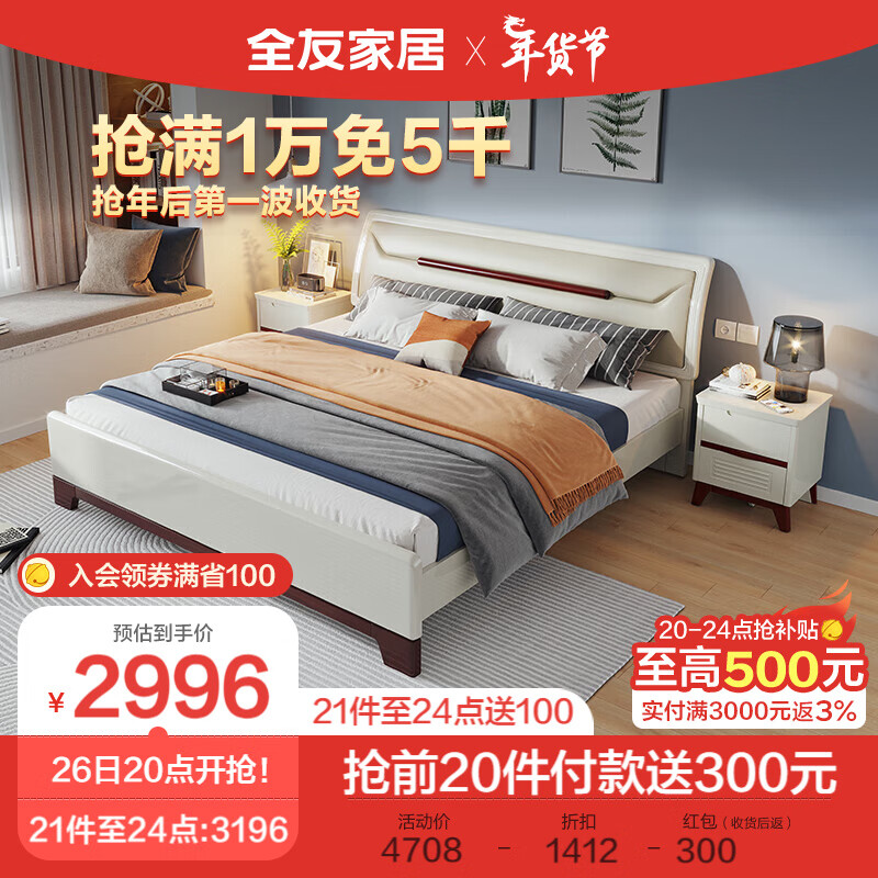 全友家居 双人床简约北欧卧室软靠板式床婚床组合大床 121806价格:4708.57元!