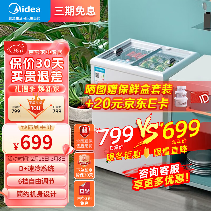 美的展示柜冷藏保鲜柜 冰柜商用 家用小型冷柜家用冰柜 商用大容量雪糕展示柜100升MS-100LGE价格:759.00元!