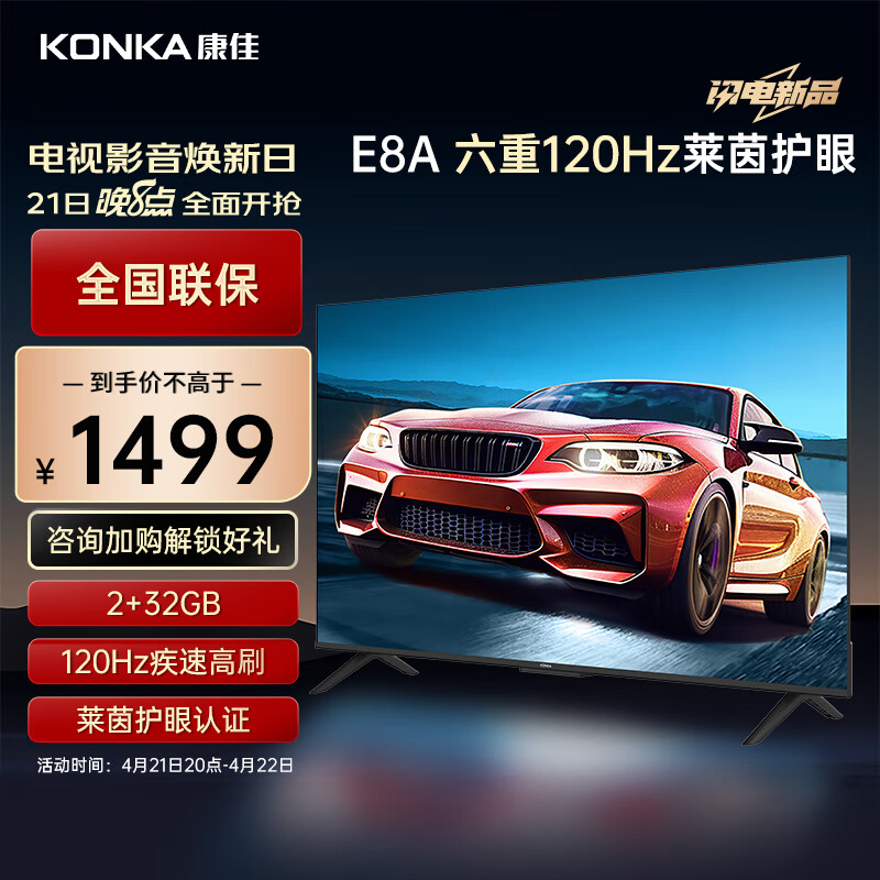 康佳电视 50E8A 50英寸 2+32GB 120Hz高刷护眼电视 4K超清屏投屏 智能语音液晶平板电视机以旧换新价格:1499.00元!