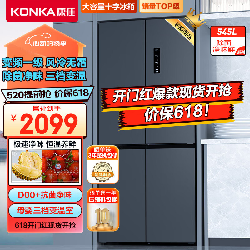 康佳545升双变频一级能效无霜双循环除菌净味母婴专属空间十字对开双开四开门电冰箱BCD-545WEGQ4SP价格:2099.00元!
