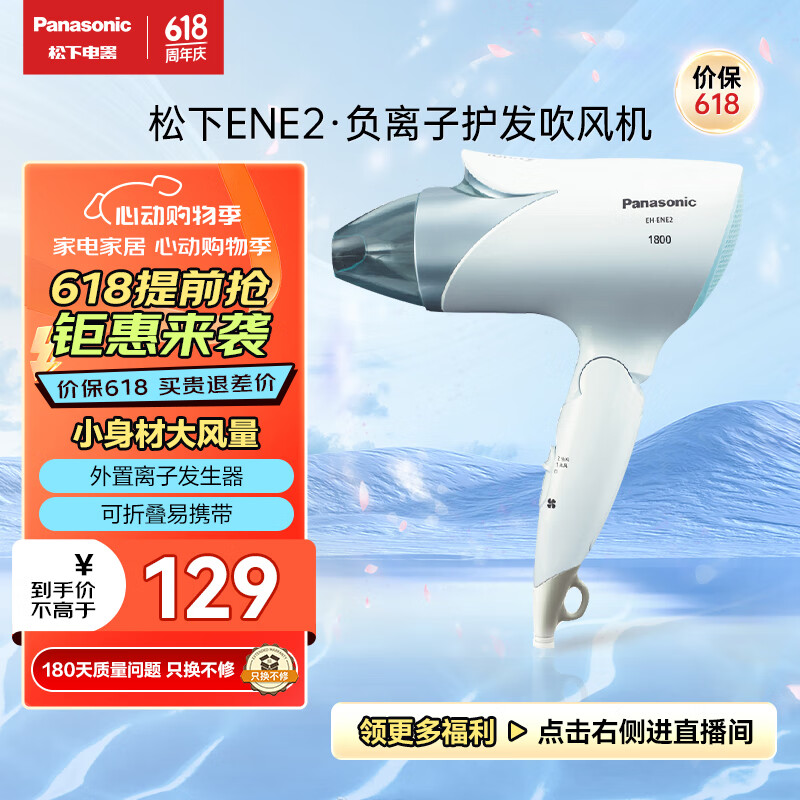 松下(Panasonic)电吹风机 大功率家用高速大风力速干折叠便携学生宿舍用礼物吹发负离子护发吹风筒ENE2价格:129.00元!