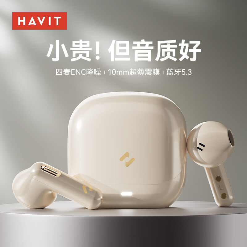 海威特(HAVIT)真无线半入耳式蓝牙耳机音乐游戏运动耳机通话降噪低延迟长续航通用苹果小米华为手机 流金白价格:119.00元!