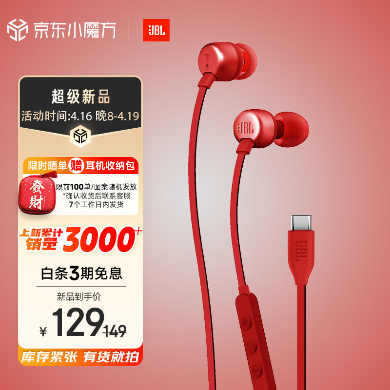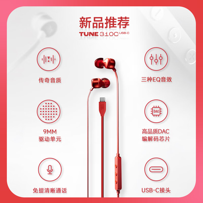 JBLTUNE310C 有线耳机Type-C接口 立体声入耳式耳机 电脑耳机 适用于华为苹果USB-c 接口手机 红色价格:129.00元!