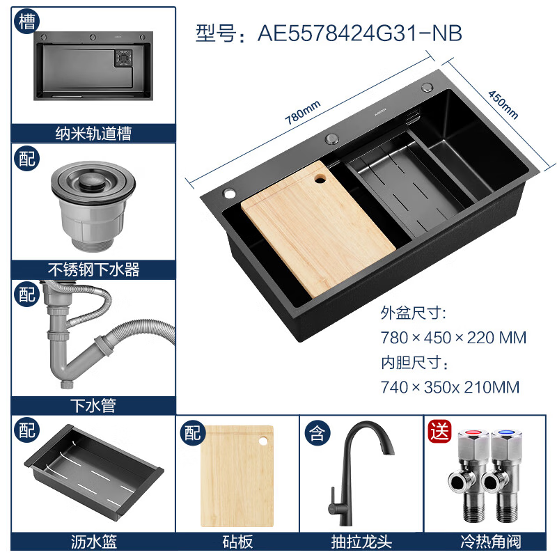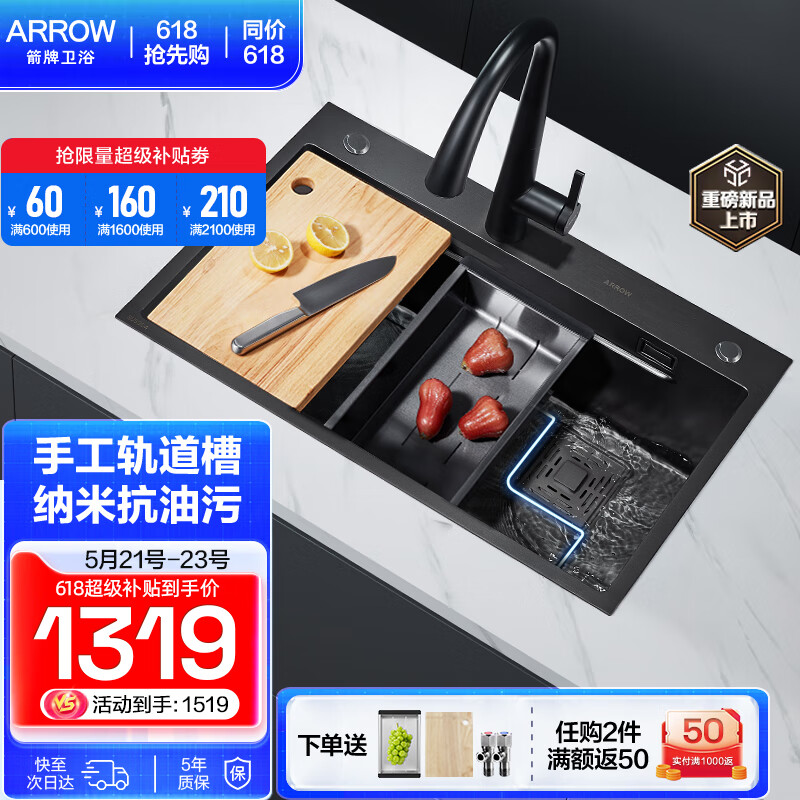 箭牌(ARROW)304不锈钢水槽手工纳米轨道大单槽厨房洗菜盆洗菜池洗碗一体盆 78黑手工纳米轨道槽-含抽拉龙头价格:1786.00元!
