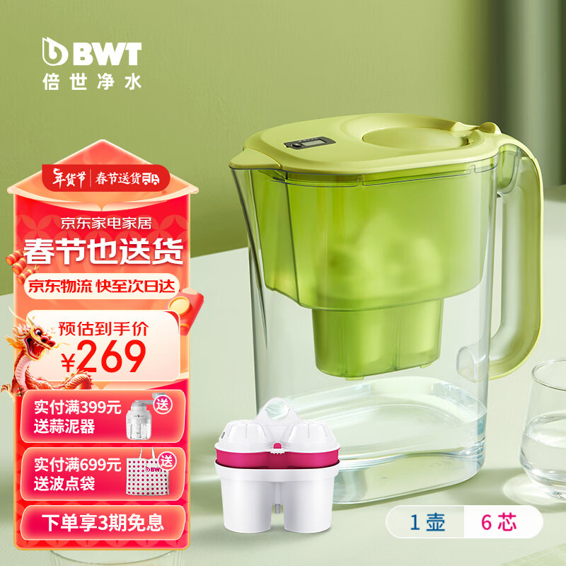 倍世(BWT) 净水壶滤水净水器家用 欧洲进口滤芯去水垢增强55% 益家系列大容量过滤器 绿色款-1壶6芯镁离子价格:399.00元!