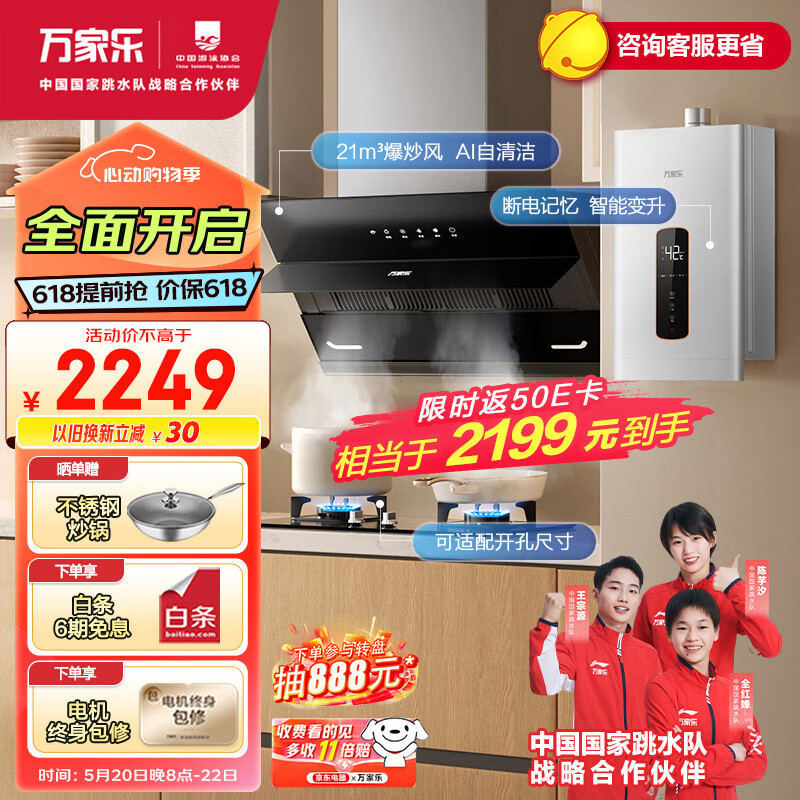 万家乐烟灶热水器三件套 21立方挥手烟灶套装13L智能变升燃气热水器多件套装AJ4+AY4C+13DP2天然气价格:2449.00元!
