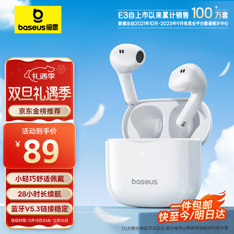 倍思E3 真无线蓝牙耳机 佩戴舒适半入耳蓝牙5.3 音乐运动耳机低延迟适用苹果华为小米oppo手机 白色价格:89.00元!