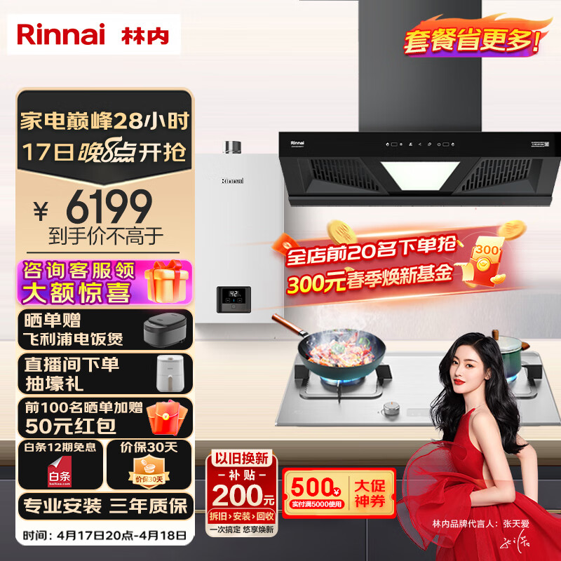 林内(Rinnai)【哪吒】油烟机厨房多件套23立方挥手智控5.2kW可调节底盘13升恒温热水器三件套11T+08MTX+13GD31价格:6199.00元!