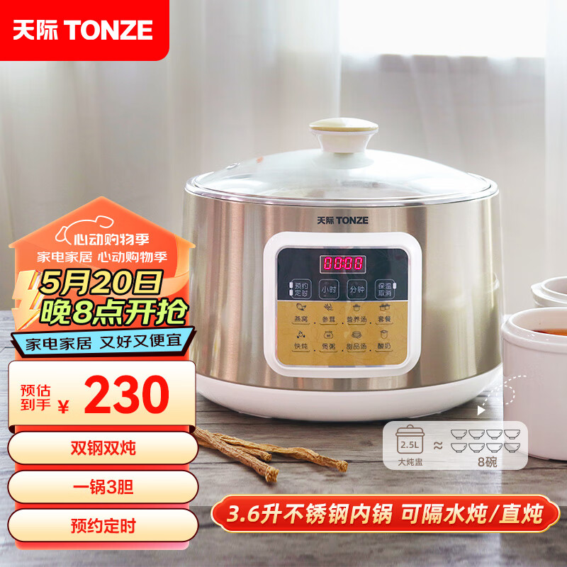 天际(TONZE)电炖锅 电炖盅 隔水炖锅 煲汤锅炖汤锅 熬粥燕窝养生 不锈钢锅体 白瓷3胆 DGD25-25CWG 2.5L价格:230.00元!
