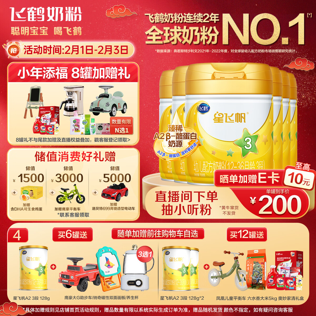 飞鹤星飞帆A2 β-酪蛋白奶源版 幼儿配方奶粉 3段(12-36月龄) 708g*6价格:1463.40元!