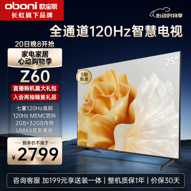 长虹欧宝丽75Z60 75英寸全通道120Hz高刷游戏电视 七大高刷场景 2+32GB 智能平板液晶电视机 以旧换新价格:2899.00元!