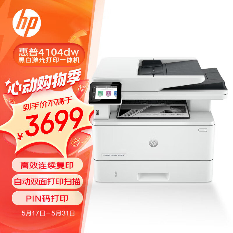 惠普(HP)4104dw黑白自动双面无线激光打印机 打印复印扫描一体机 无线连接 连续复印 企业办公商用价格:3499.00元!