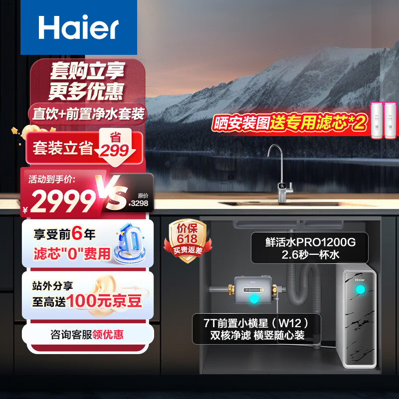 海尔(Haier)净水器1200G鲜活水 pro家用净水机6年RO反渗透大通量净水器+前置过滤器HKC3000-R793D2U1+横置w12价格:2999.00元!