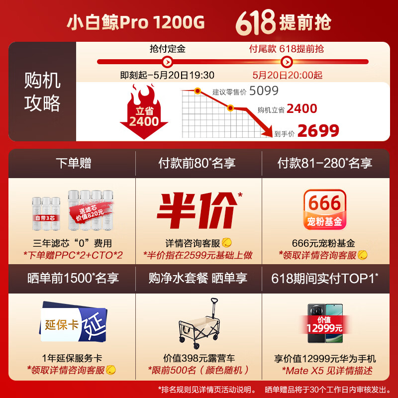 沁园(TRULIVA)小白鲸pro大通量1200G家用净水器5年RO反渗透厨下直饮3.3L/分钟 UR-S51246i价格:2599.00元!