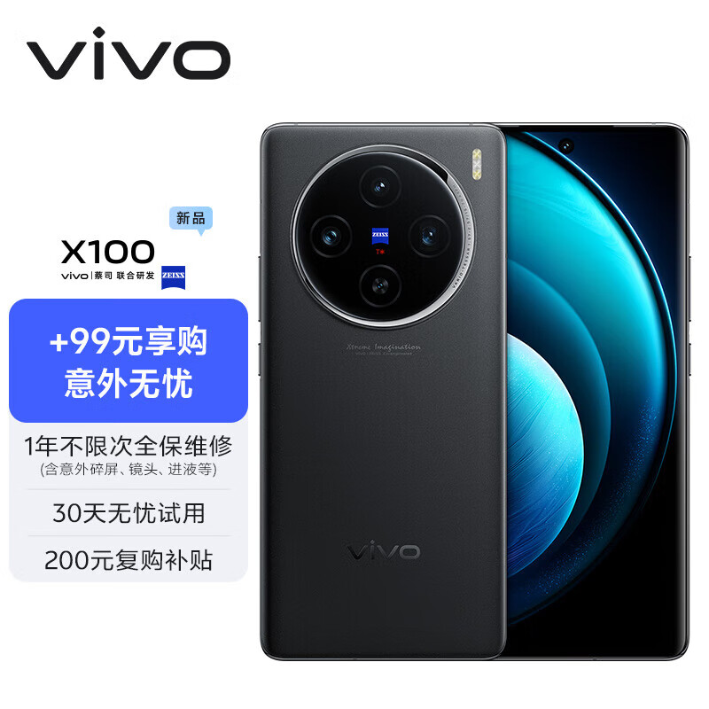 vivo X100 12GB+256GB 辰夜黑【意外无忧套装】蓝晶×天玑9300 5000mAh蓝海电池 蔡司超级长焦 5G 拍照 手机价格:4098.00元!