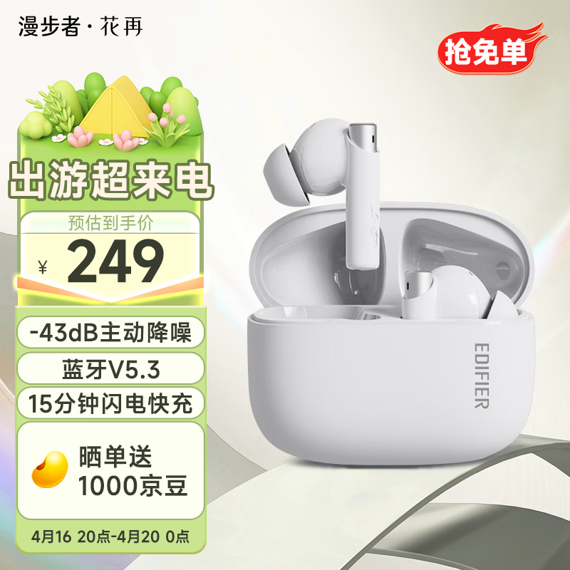 漫步者花再Zero Pro 无线主动降噪蓝牙耳机 入耳式耳机 无线游戏音乐耳机 长续航 适用苹果安卓华为小米 雾白价格:249.00元!