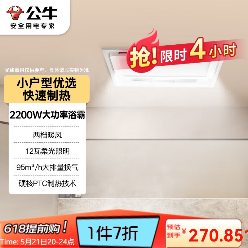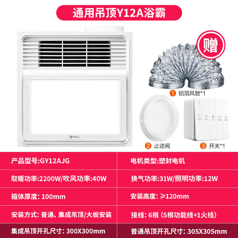公牛(BULL)浴霸GY12AJG小户型两档暖风2200W风暖+40W吹风+31W换气+12W照明价格:386.93元!