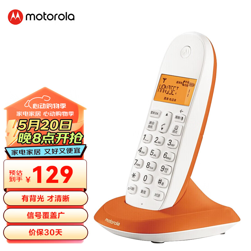 摩托罗拉(Motorola)数字无绳电话机 无线座机 子母机 单机 办公家用 来电显示 三方通话 C1001XC(橙色)价格:122.55元!