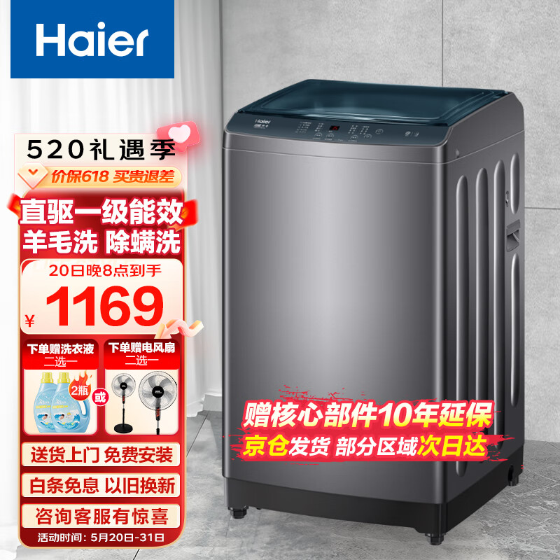 海尔(Haier)10KG波轮洗衣机全自动家用大容量直驱变频一级能效预约除螨羊毛洗 以旧换新XQB100-BZ506[家电]价格:1169.00元!