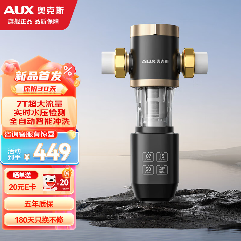 奥克斯(AUX)前置过滤器自动冲洗净水器家用 全屋智能7T大流量 40微米自来水全自动净水反冲洗Q80价格:499.00元!