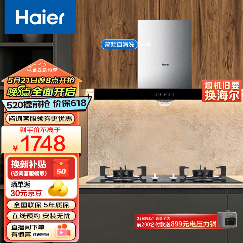 海尔(Haier)抽油烟机 烟灶套装 19m3/min大吸力420pa大风压高频自旋洗家用欧式5.0kW灶T3S+Q2BE2(天)价格:1748.00元!