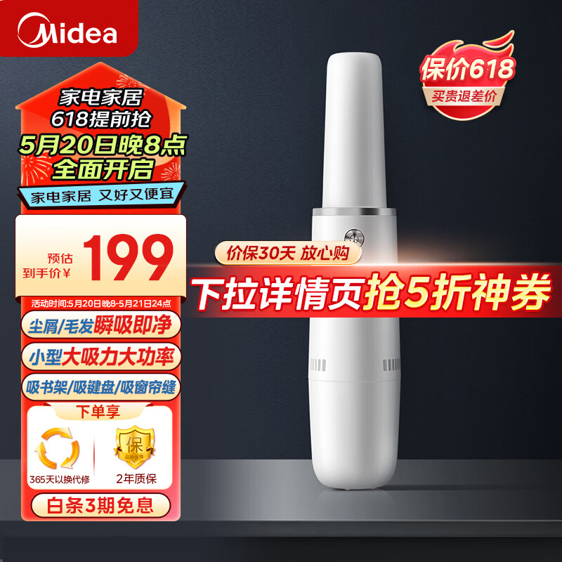 美的(Midea)无线手持吸尘器TK2C 车家两用小型大吸力大功率便携外带家庭适用价格:199.00元!