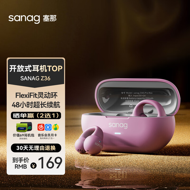 SANAGZ36塞那【开放式耳机TOP】骨传导概念蓝牙耳机无线夹耳夹式耳机不入耳挂耳式运动耳机通话降噪 落霞粉|杜比环绕音|限定色价格:199.00元!