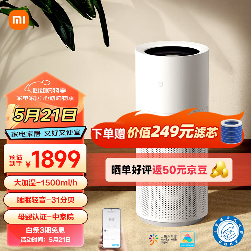 米家小米无雾加湿器3Pro 卧室轻音家用办公室大面积 1500ml/h极速加湿 母婴认证电解水UV杀菌价格:1899.00元!