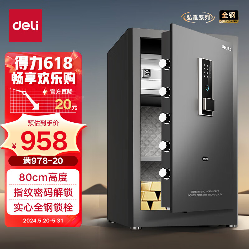 得力保险柜 家用办公指纹密码保管箱小型保密箱全钢防盗可入墙保管柜保险箱 80cm黑色 弘雅AE67-ZM价格:978.00元!
