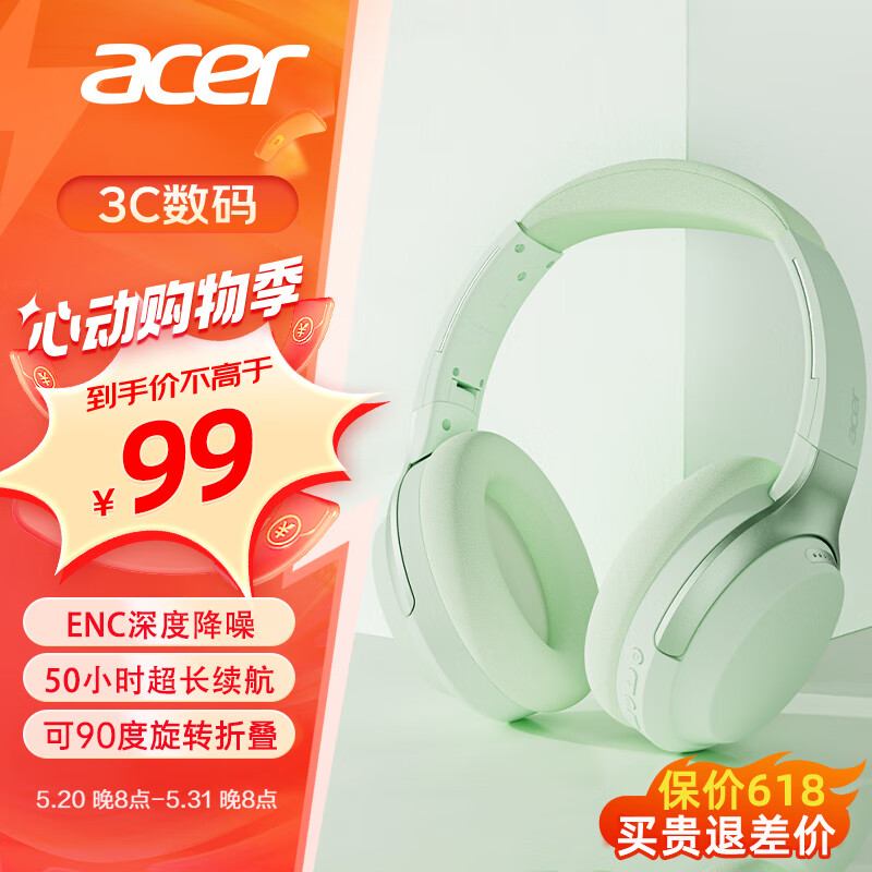 宏碁(acer)OHR205 头戴式无线蓝牙耳机 游戏音乐运动长续航降噪耳机 苹果华为小米手机通用 绿色价格:129.00元!