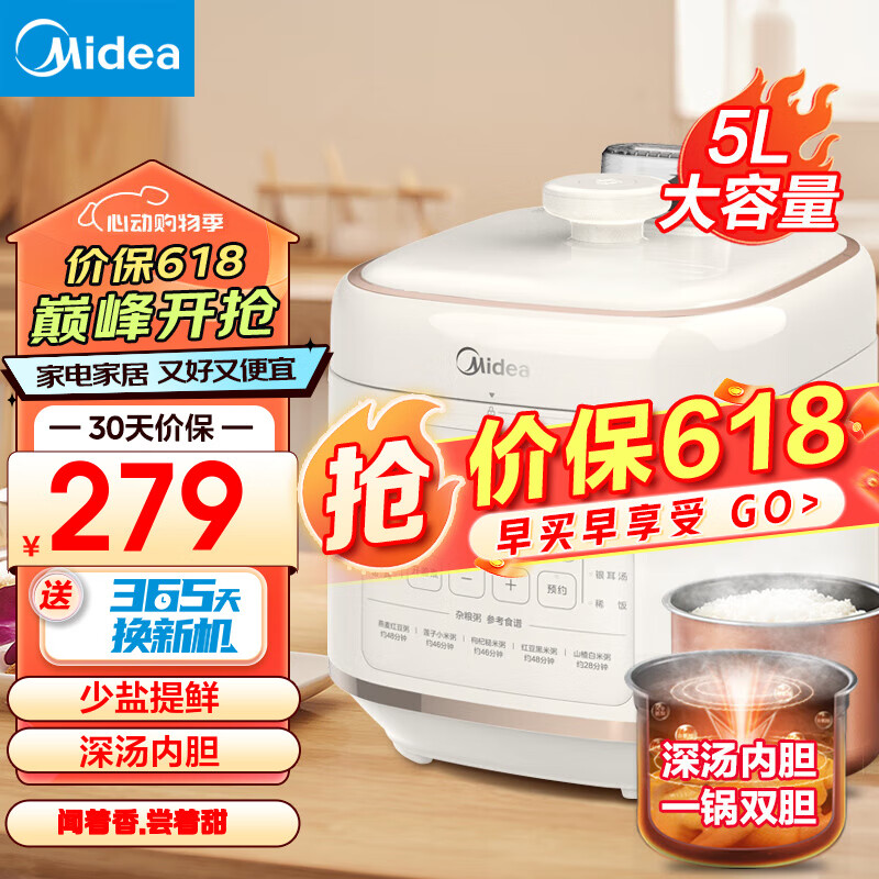 美的(Midea)电锅 深汤提鲜系列少盐家用高压锅5L大容量多功能智能高压电饭煲电饭锅 提鲜高汤|MY-C548(4-10人) 5L价格:399.00元!