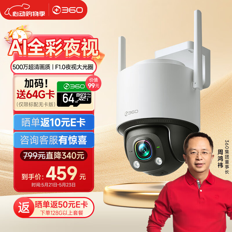 360【周鸿祎直播】户外球机6Ultra昼夜真彩版500万超清家庭监控器360度全景室外摄像头防水夜视价格:459.00元!