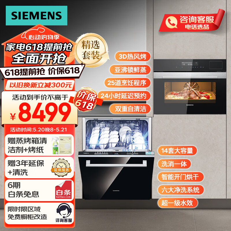 西门子(SIEMENS)全自动家用嵌入式洗碗机636pro 蒸烤一体机套装 14套大容量 CS389ABS0W+SJ63EX00KC(含黑门板)价格:8499.00元!