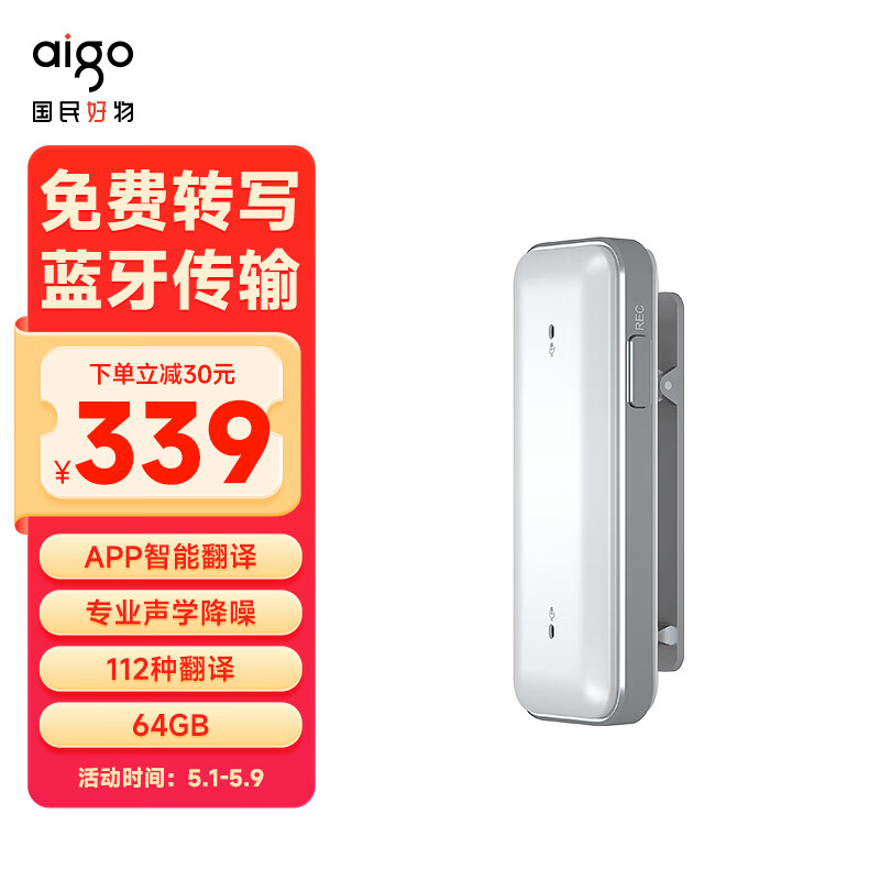 爱国者aigo SR20p智能Ai录音笔 专业高清降噪 会议录音转文字 录音器 同声传译 64G白色价格:339.00元!