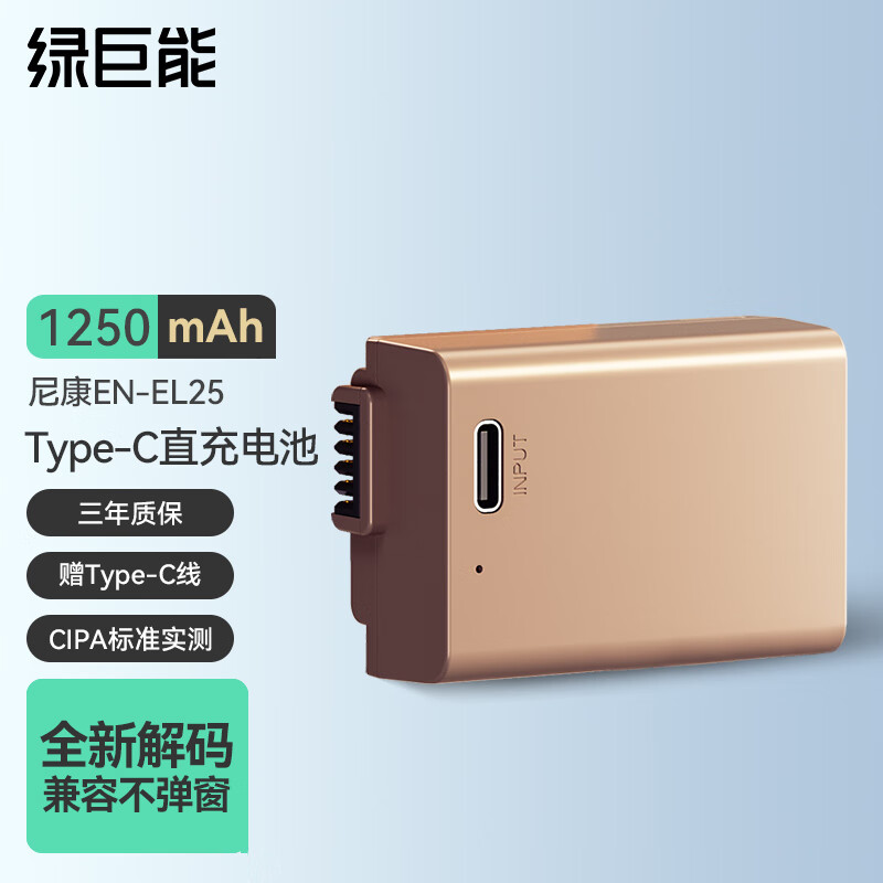 绿巨能(llano)尼康EN-EL25相机电池Zfc直充电池Z30/Z50/Z系列微单相机Type-C直充口电池1250mAh价格:209.00元!