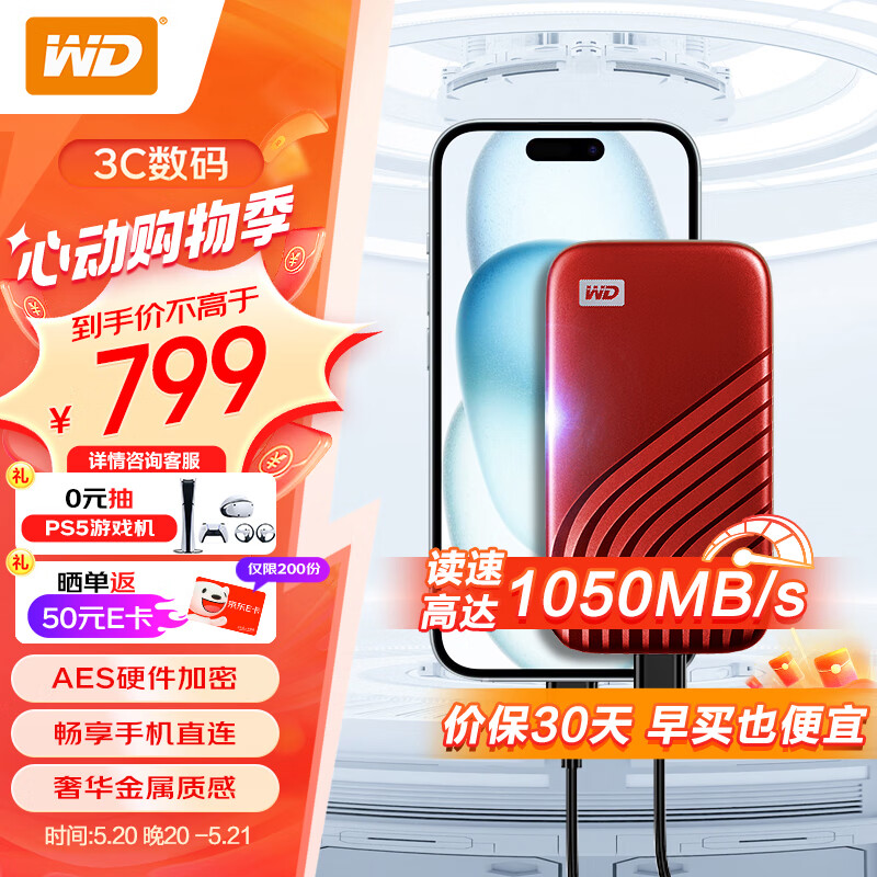 西部数据(WD)1TB NVMe 移动固态硬盘(PSSD)My Passport随行SSD type-c接口 1050MB/s 手机直连笔记本外接价格:799.00元!