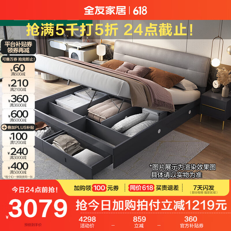 全友家居 主卧室轻奢板式落地高箱储物软包床1.8x2米双人床家具126805价格:4298.75元!