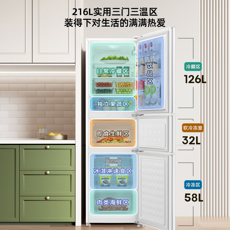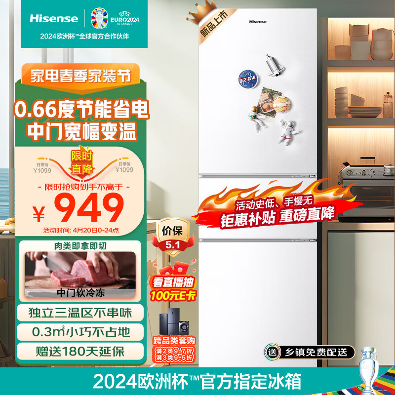 海信(Hisense)冰箱三开门小型 家用电冰箱 216升三门租房用小户型BCD-216YK1F节能省电白色【207升级款】价格:949.00元!